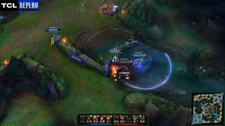 [21:48]徐神赛恩河道开车撞飞Elk,Junjia杰斯一炮跟上,徐神拿到Elk人头,随后双方交换技能拉开。