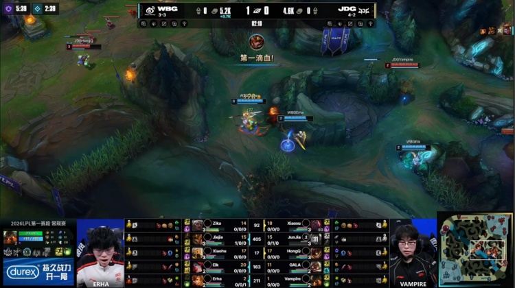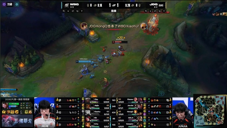 [2:01]Jiejie皇子鱼Erha女坦野辅联动进JDG野区逮捕Junjia杰斯,Jiejie拿到一血。