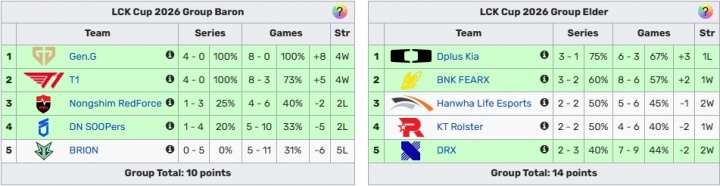 目前由于大龙组除了GEN和T1分别以4胜0负拿到8分外,NS和DNS都只有1分,而BRO则只有0分,总分10分;另一边远古龙组则是更加平均,总分为14分。