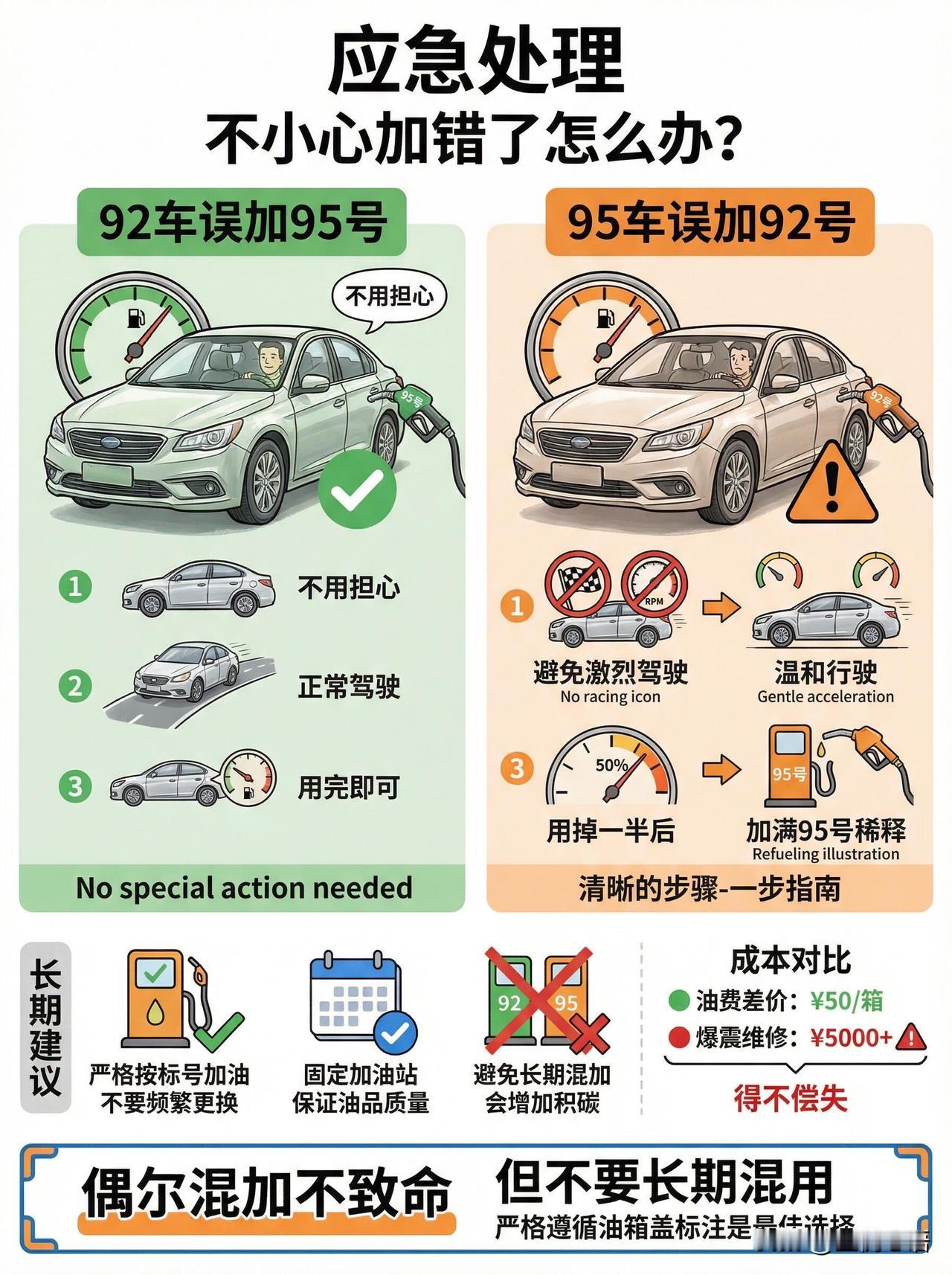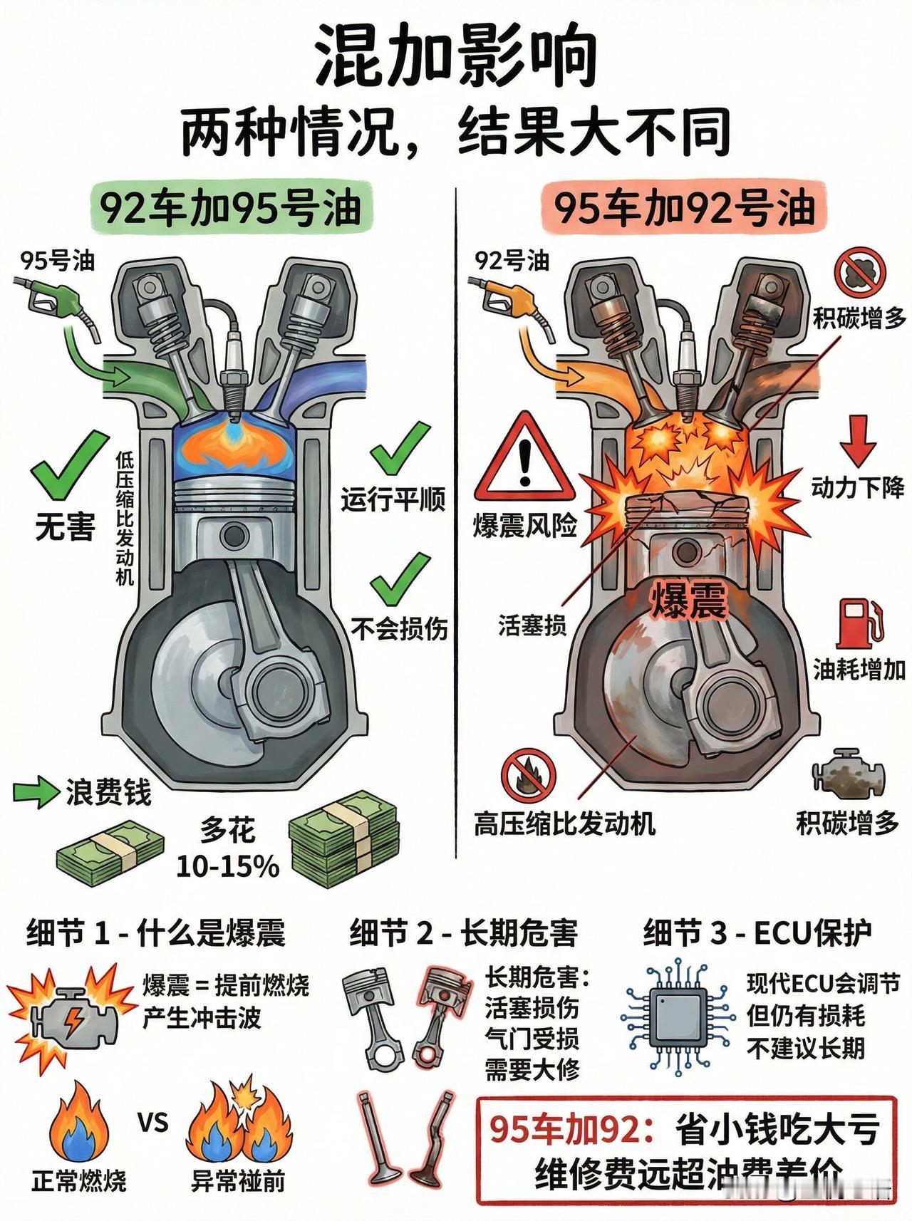92和95汽油到底能不能混加? 每次加油都能碰到纠结的朋友, 92和95到底能不能混加? 关键看车辆需求~ 先把真相说透: 标号只代表抗爆性,跟干净度、耐烧度没关系! 92车加95?安全但纯纯浪费钱。 发动机不会更有劲,就是多花10-15%油费,下次换回92就行。 95车加92?那可真不行! 容易爆震,动力下降还费油,长期用会伤活塞、气门,修车费比省的油钱多百倍。 误加了也别慌,95车加错92就温和开,油用一半赶紧补95稀释。(老车以前的93、97,对应现在的92、95) 记住唯一标准:看油箱盖标注! 厂家让加啥就加啥,别听老司机瞎忽悠。 偶尔混加一次没事,长期乱加可就坑车咯~