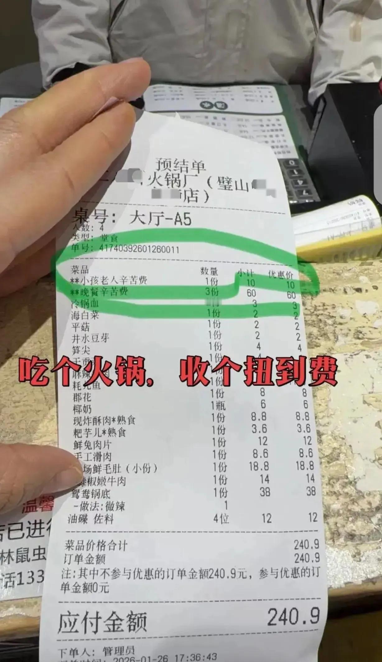 “离大谱了!”重庆,一女子和家人去重庆老火锅吃饭,花了240.9元,结账时,女子惊讶的发现,火锅店收晚餐辛苦费,大人每人20元,小孩老人每人10元,一共收了她70元辛苦费,女子气的不轻,火锅店却回应:辛苦费明码标价,菜品和酒水都是按进价卖的,有异议的,就给免单。网友:老板还可以收场地费,因为要交房租啊! 本是一场和家人围坐吃火锅的温馨聚餐,却因为一笔突如其来的辛苦费,彻底搅黄了用餐的好心情。 总餐费不过两百出头,单独收取的辛苦费就占到近三成,这样的收费方式,任谁遇到都会觉得难以接受。 餐饮消费本是一件简单的事,顾客进店点餐、用餐,为食材和对应的服务支付费用,是大家早已习惯的消费逻辑,可这家火锅店的操作,直接打破了这种常规,也难怪消费者会满心气愤。 面对争议,火锅店给出的解释是菜品酒水都按进价销售,没有利润空间,辛苦费是用来覆盖房租、人工等经营成本,还表示有异议可以免单。 乍一听似乎有几分道理,可细细琢磨就会发现,这完全是把商家本该承担的经营成本,强行转嫁给了消费者。 餐饮行业的运营本就包含食材、人工、房租等各项成本,这些成本本该核算在菜品定价之中,服务也是餐饮消费的配套内容,顾客支付的餐费,天然就涵盖了这些部分,根本没有理由再单独拆分出所谓的晚餐辛苦费。 而店家提出的有异议就免单,也并非是大度的表现,更像是拿捏了多数消费者顾及情面、不愿当众争执的心理。 很少有人会为了几十块钱在餐厅闹得不愉快,店家正是看准这一点,用极低的成本,让不合理的收费变得看似合理。 这件事之所以引发网友的广泛讨论,核心不在于70元的金额多少,而是这种收费模式带来的隐患。 网友的吐槽也道出了大家的担忧,如果这种单独收取辛苦费的方式被认可,那是不是未来餐饮消费中,还会出现空调使用费、桌椅折旧费、餐具清洁费等各种巧立名目的费用?商家的经营成本,不该被这样无限拆解,全都摊到消费者身上。 商家想要盈利无可厚非,但盈利的方式应该是提升菜品品质、优化服务体验,通过合理的定价获取收益,而不是用这种转嫁成本、违背消费常识的方式,消耗消费者的信任。 大家对此怎么看?欢迎评论区留下您的观点!