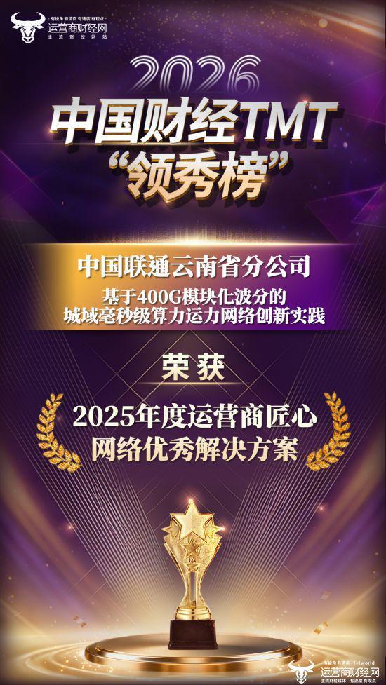 2026中国财经TMT“领秀榜”盛典已于1月29日正式拉开帷幕,本次盛典正式公布了“2025年度运营商匠心网络优秀解决方案”的获奖名单。其中,云南联通项目基于400G模块化波分的城域毫秒级算力运力网络创新实践表现出色,成功将这项大奖收入囊中。