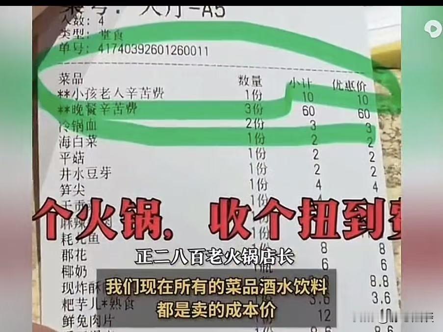 离大谱了!重庆,女子带一家4个大人1个孩子,去一家老火锅店吃饭,一共花了240.9元,紧接着她发现一个不可思议的事,结账单上写着晚餐辛苦费70元,大人20元/人,小孩10元/人,她当时就懵了,这也太多了,这钱都占总消费的三分之一。她跟工作人员理论,对方回复本店明码标价,菜品都是按进价卖,根本不喜欢钱,就靠辛苦费给员工发工资,女子不理解,你发工资跟我有啥关系,凭啥我给辛苦费! 1月26日下午,女子带着家人兴冲冲冲进一家老火锅店,想着搓顿地道火锅热闹热闹。 进店一看,菜品又多又实在,价格也挺亲民,一家人放开肚皮吃了个酣畅淋漓。 满心以为这顿吃得划算又舒心,结果结账时被账单结结实实背刺一把。 女子在外吃饭有核对账单的习惯,这一眼扫过去直接惊得合不拢嘴,手里的账单都差点没拿稳。 账单最显眼的地方赫然写着两项从没听过的收费规定。 小孩老人辛苦费1份10元、晚餐辛苦费3份60元,俩加起来70元。 合着这顿饭才花了240.9元,光辛苦费就占了总消费的三分之一。 她立马问店员,这啥钱啊?来吃火锅还要给辛苦费? 店员的解释更是让她火冒三丈:店里规定,进店消费就得收辛苦费,晚餐大人20块一位,小孩老人10块。 还说这辛苦费就是人工工资,而且早就明码标价了,菜单上、门口都有提示。 之所以收这笔钱,是因为菜品酒水都按进价卖,不赚钱,全靠辛苦费给员工发工资。 女士越听越气,我们来吃饭,你们提供服务是天经地义的。 你这就是变相收小费,小费哪有强行要的道理! 老开门做生意,给员工开工资本来就是你的责任,凭啥转嫁到顾客身上。 让我们给你员工发工资,根本说不通,再说你说菜品按进价卖,那房租水电装修都不用花钱?难不成你在做慈善? 老板见女子反应激烈,不想过多解释,边说这是店里新的模式。 平时都会提前跟顾客沟通,接受就吃,不接受就走,要是吃完实在不接受,也能免单。 可女子说,从进店到吃完,压根没人跟她提过辛苦费,早知道的话根本不会来。 事后女子气不过,她觉得子就去吃饭是为了快乐,整的好像自己吃不起一顿饭一样。 越想越憋屈的她把这事发到网上,评论区直接炸锅了! 有人站在女子一方:给员工开工资就是理由。 今天敢收辛苦费,明天是不是就敢收空调费、桌椅磨损费。 大家都默许的话,以后出门吃饭得揣个计算器。 也有少数网友说明码标价,愿者上钩,觉得商家有收费权,消费者有选择权。 可这话很快就被反驳了:明码标价也得提前主动说。 等人家吃完了才拿出来,这不就是先斩后奏吗。 真光明正大,带位的时候就该说清楚,愿意吃的留下,不愿意的走人。 咱就是说,吃火锅图的就是开心热闹,结果遇到这种离谱的辛苦费,换谁都得气不打一处来。 有人说这或许是一种新型的营销模式,但是目前或许大多数人还是不能接受。 对此,你怎么看这件事? @静心法谈 学法辨是非,慬法不吃亏。