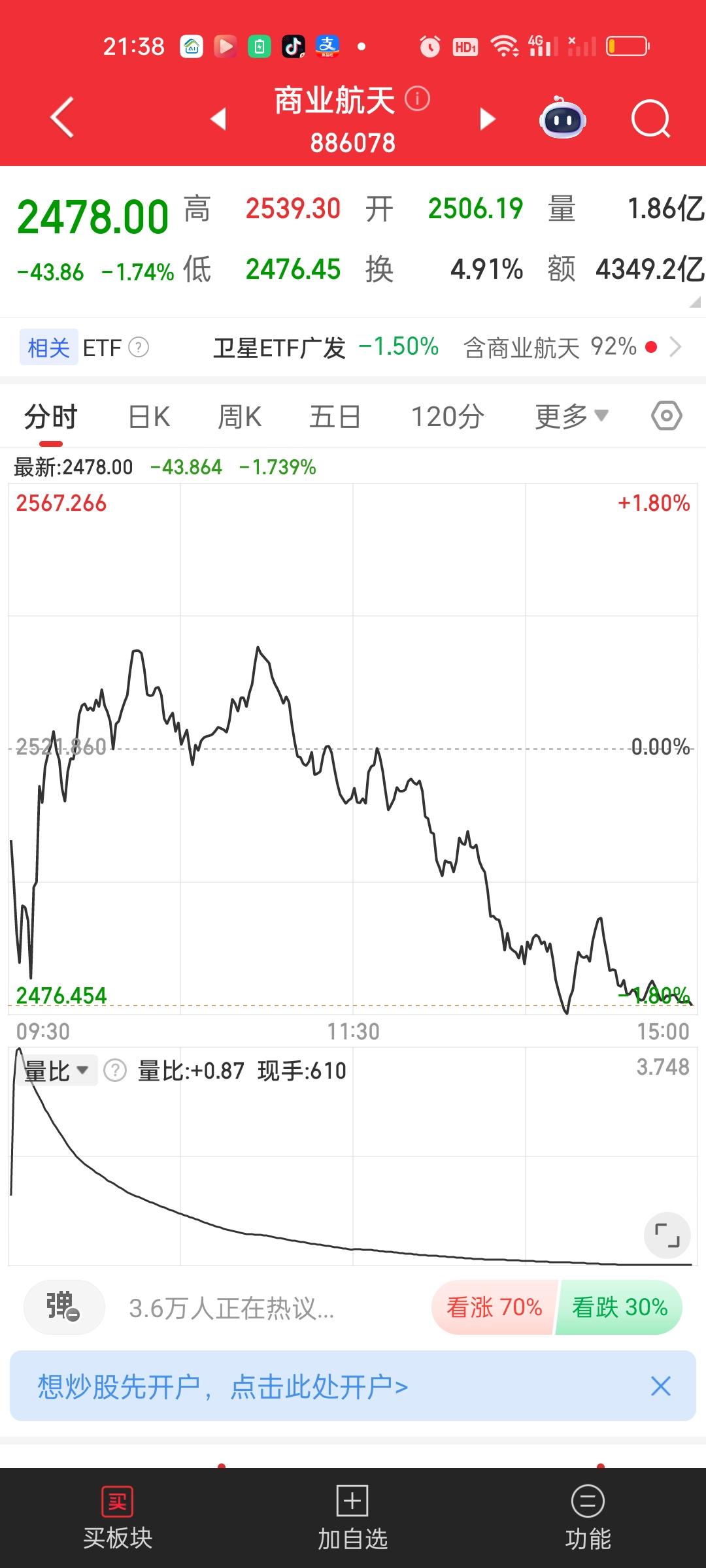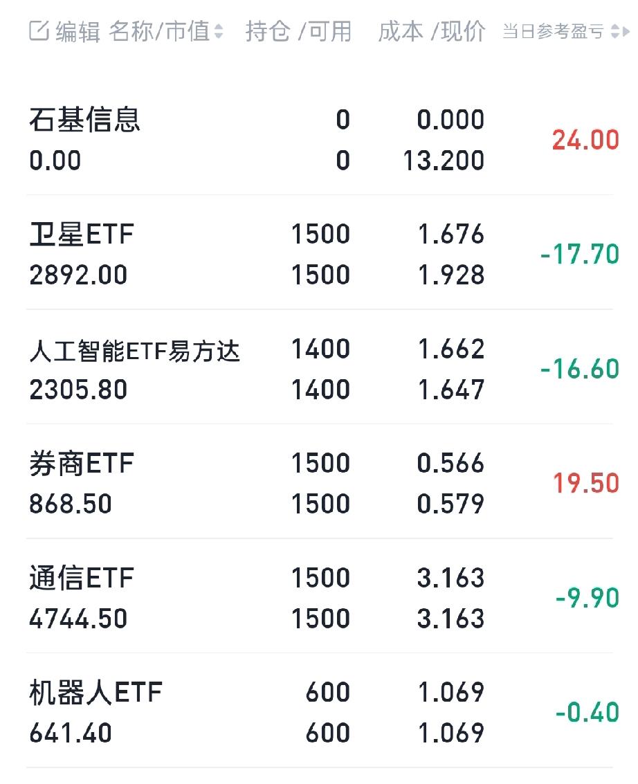 卫星ETF和商业航天板块今天收盘都跌破了20日线。从原则上讲确实要开始进入下行趋势了,调整周期1个月起步,其实今天上午明明涨得好好的。硬是被神秘力量死死压制不让上涨,没脾气! 卫星ETF今天20日线是1.947,收盘1.928,从收盘价来看确实已经跌破20日线了,我目前持有1500股,持仓成本是1.676,累计盈利400元。 商业航天今天20日线在2497.37,而今天收盘价在2478.00,收盘价也跌破了20日线。从原则上讲,明天20日线收不回来也要进入下行趋势了。 今天场内账户就亏了16元,可以忽略不计。但场外科技板块爆杀,多少也要亏一些的,只能硬抗!