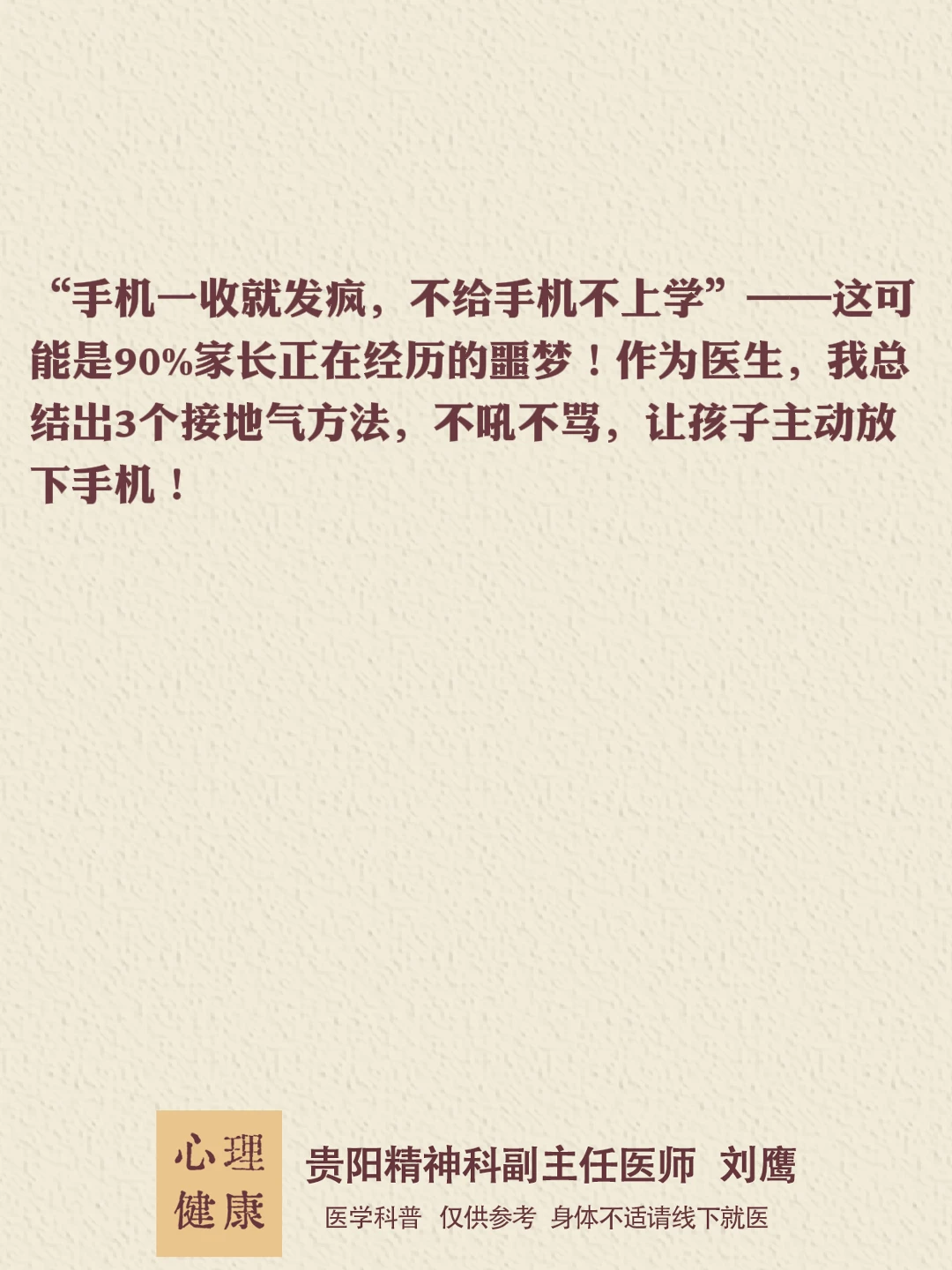 贵州的朋友们,大家好,我是贵阳精神心理科医生刘鹰 孩子不是讨厌上学,是讨厌上学时那种“我很糟糕”的感觉。 先修复亲子关系,再解决手机问题,顺序对了才有用!