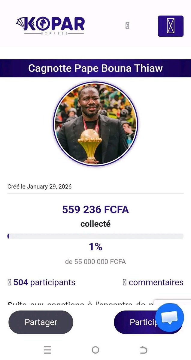 虎扑01月30日讯塞内加尔人民发起了一项众筹活动,旨在支付帕佩·蒂奥因非洲杯决赛事件而被罚款的款项!