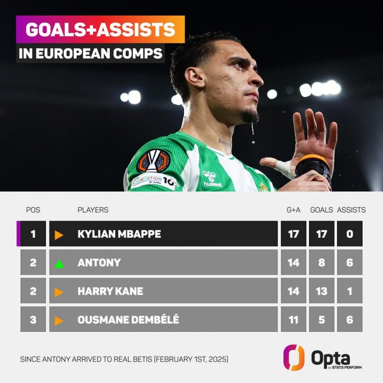 自安东尼于2025年2月1日加盟皇家贝蒂斯以来,在不含预选赛的欧战中,仅有姆巴佩(17球)参与的进球数多于安东尼。
