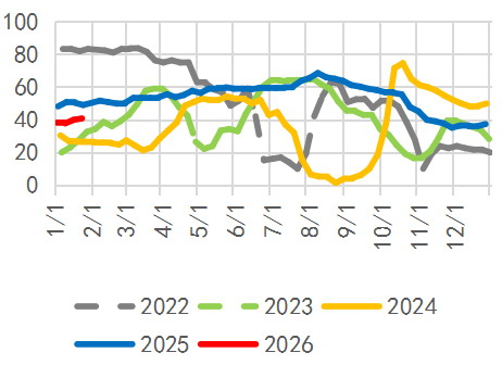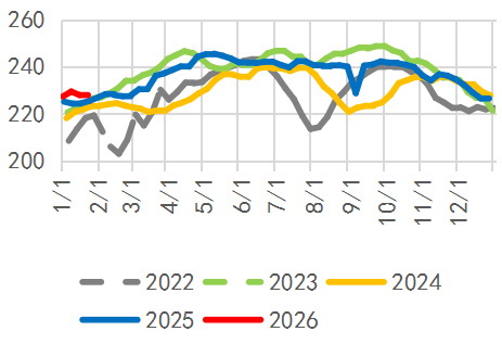 综合来看,全球铁矿石发运量中枢逐步回落,但仍处于历史偏高水平。需求端,春节前铁水产量预计持稳,淡季需求偏弱及安全检查将压制铁水复产空间。港口库存延续累积态势,但边际增速放缓。钢厂补库接近尾声,短期以补充海漂货为主。