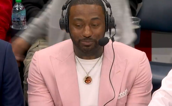 比赛的第二节,镜头给到正在现场解说,身穿粉丝西装的前奇才球员约翰-沃尔,本场比赛奇才主场将为沃尔举办纪念活动。