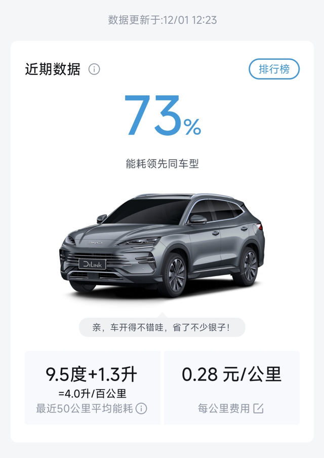 25款宋plusdmi能耗表现 走了一个星期,目前没有发现大的问题。一个星期走了300多公里,有一半是高速,一半是城区道路,按APP的能耗换算大概3毛钱一公里,总得来说还是比较省的。1块9一度电是在我没有安装充电桩在外面用慢充桩的情况下,后续安装了充电桩,应该能到1毛钱一公里