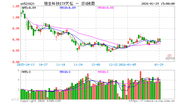 1月29日,恒生科技ETF天弘(520920)跌1.11%,成交额3.32亿元。当日份额增加2.00亿份,最新份额为162.06亿份,近20个交易日份额增加37.87亿份。最新资产净值计算值为145.14亿元。