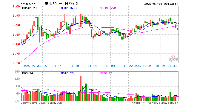 1月30日,电池ETF景顺(159757)开盘跌0.11%,报0.884元。电池ETF景顺(159757)重仓股方面,比亚迪开盘跌0.04%,宁德时代涨1.90%,三花智控涨0.04%,华友钴业跌3.31%,亿纬锂能涨0.00%,赣锋锂业跌1.79%,天赐材料跌0.49%,先导智能跌0.51%,国轩高科跌0.35%,厦门钨业跌4.48%。