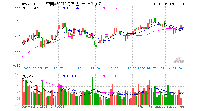 1月30日,中国A50ETF易方达(563000)开盘跌0.65%,报1.078元。中国A50ETF易方达(563000)重仓股方面,宁德时代开盘涨1.90%,紫金矿业跌5.18%,贵州茅台跌0.19%,工业富联跌1.04%,中际旭创涨0.38%,比亚迪跌0.04%,寒武纪跌0.00%,洛阳钼业跌4.92%,招商银行涨0.00%,海光信息涨0.00%。
