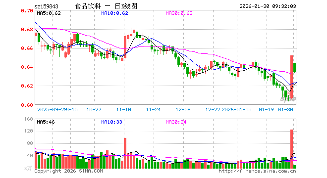1月30日,食品饮料ETF(159843)开盘跌1.23%,报0.644元。食品饮料ETF(159843)重仓股方面,贵州茅台开盘跌0.19%,五粮液涨0.00%,伊利股份跌0.48%,泸州老窖涨0.24%,山西汾酒跌0.29%,海天味业跌0.30%,东鹏饮料涨0.53%,洋河股份跌1.71%,双汇发展跌0.39%,今世缘涨0.00%。