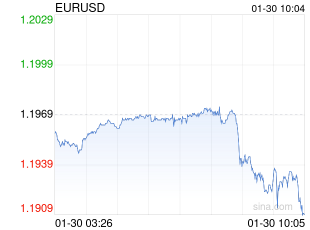 新浪外汇消息2026年01月30日,截至10时04分,外汇市场上欧元兑美元汇率跌破1欧元兑换1.1908美元。跌幅为-0.5097%