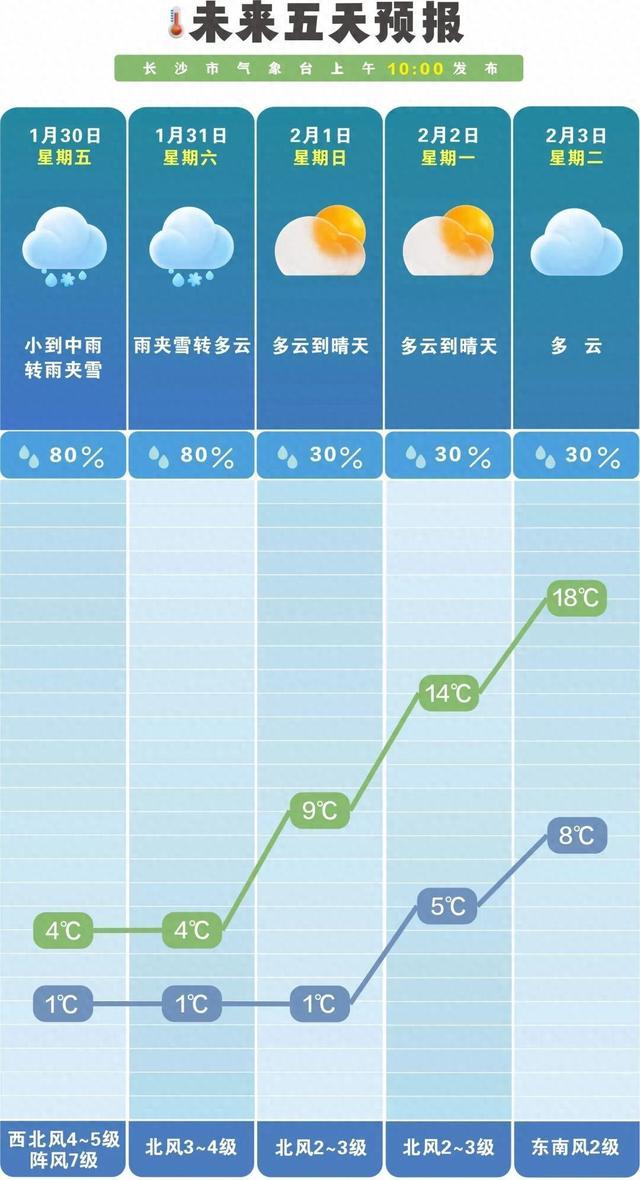 记者今日从长沙市气象部门了解到,受冷空气影响,今晚到1月31日白天,长沙将有一次明显降温降雨(雪)天气过程,气温将大幅下降4℃至6℃,最低气温0℃至1℃,北风加大至4到5级,阵风可达7级。1月30日晚上到31日中午,大部分地区小到中雨转雨夹雪(山区中到大雪),浏阳中东部小到中雨,北风4级,气温1℃至4℃(山区-1℃至1℃);1月31日下午到2月1日,天气将逐步转好,虽然转为多云到晴天,但清晨有霜冻,气温在1℃至9℃之间。
