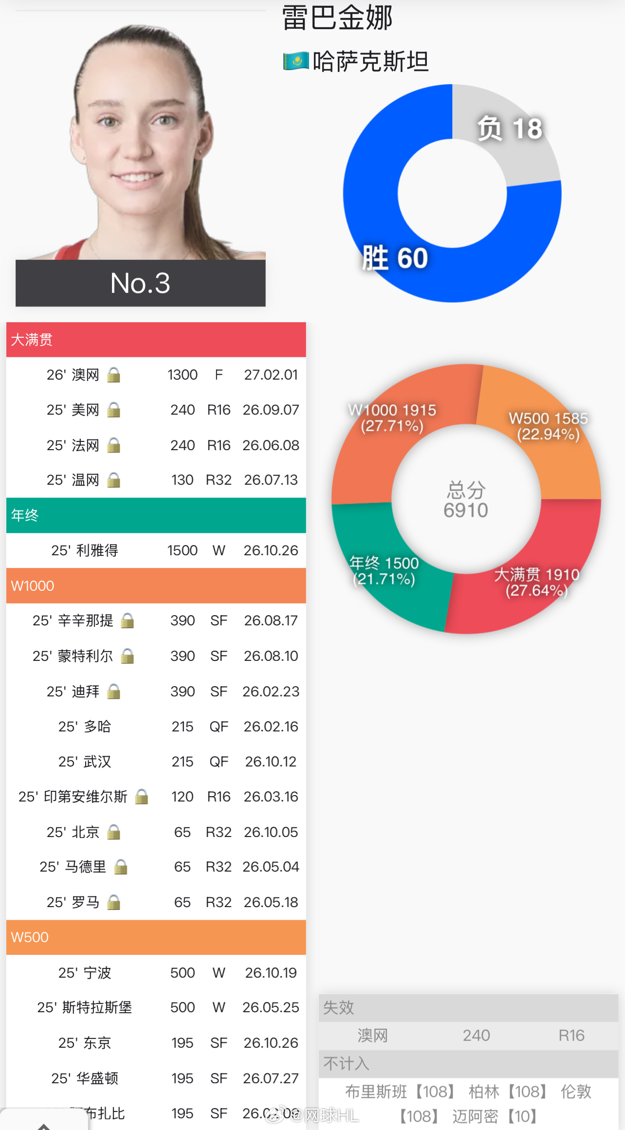 莱巴金娜即时排名来到No.3,追平职业生涯最佳你觉得她今年会突破No.3最高排名吗?网球talking大会澳网2026莱巴金娜重返大满贯决赛