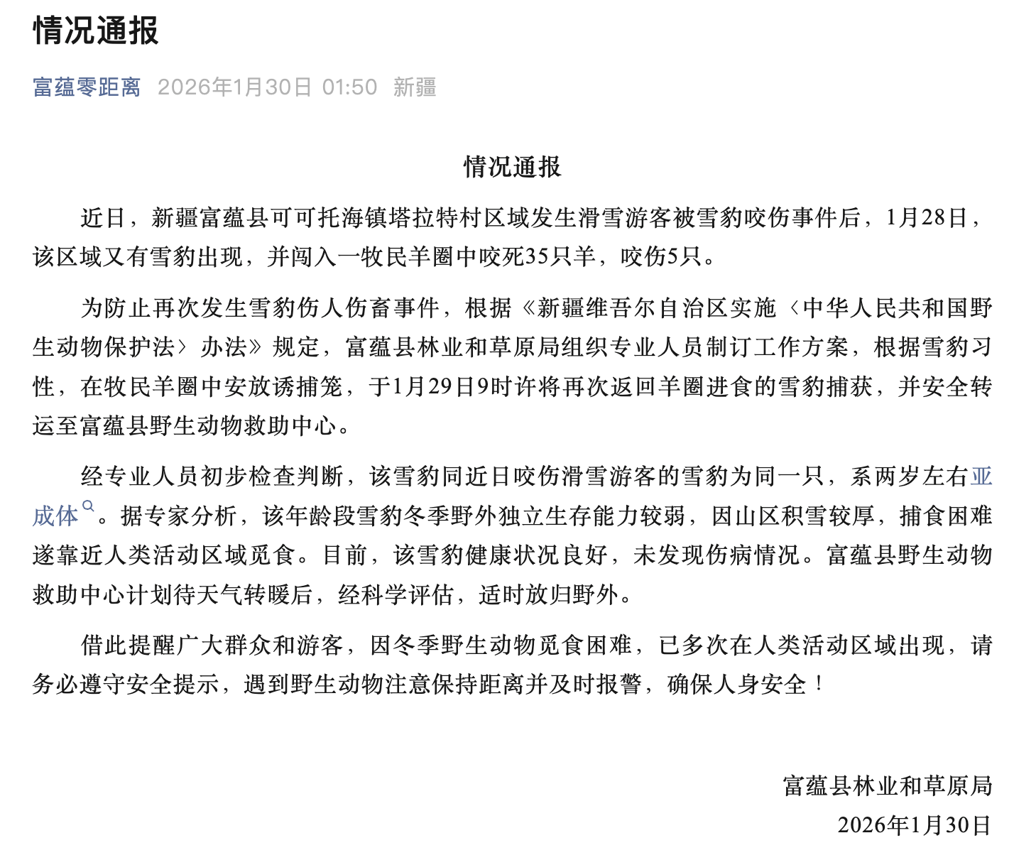 近日,新疆富蕴县可可托海镇塔拉特村区域发生滑雪游客被雪豹咬伤事件后,1月28日,该区域又有雪豹出现,并闯入一牧民羊圈中咬死35只羊,咬伤5只。