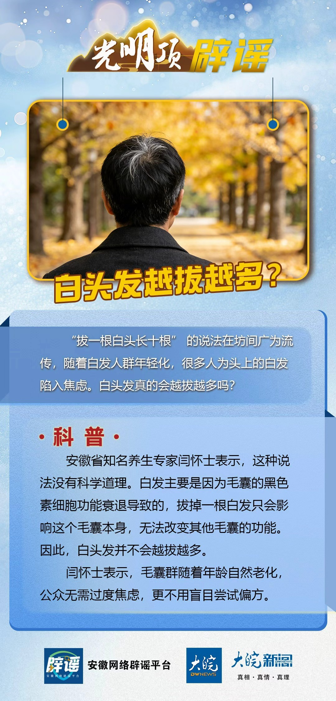 大皖新闻讯随着白头发人群年轻化,很多人为头上的白发陷入焦虑。而最近有网民在网上发布消息,称“扯一根白头长十根”,这让一些读者陷入新的焦虑。那么,果真如此吗?1月29日,记者采访了安徽省知名养生专家闫怀士。他表示,此说法没有任何科学道理。