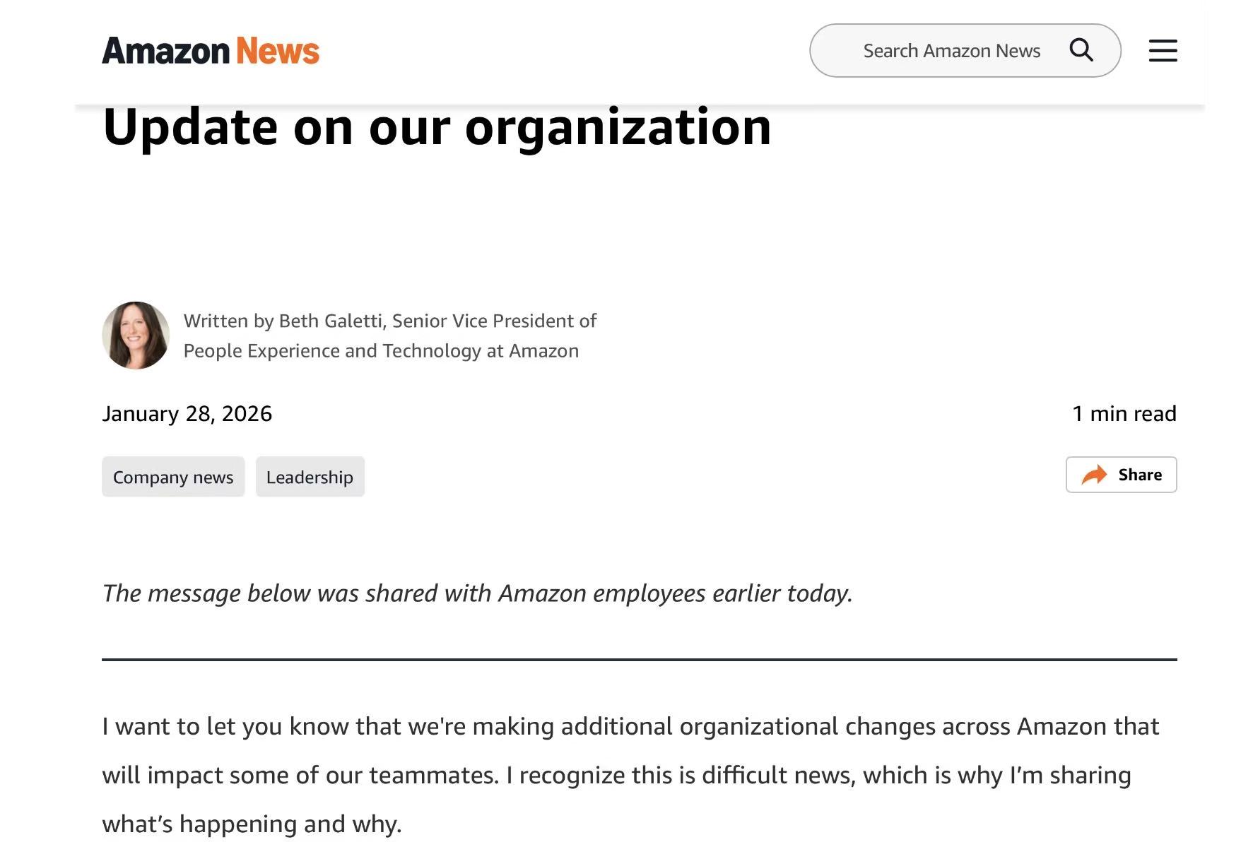 1月28日,亚马逊人力资源与技术高级副总裁贝丝·加莱蒂(BethGaletti)发文宣布,公司将进行人员缩减,预计影响约16000个职位。