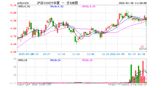 1月30日,截止午间收盘,沪深300ETF华夏(510330)跌1.23%,报4.901元,成交额9.94亿元。沪深300ETF华夏(510330)重仓股方面,宁德时代截止午盘涨2.93%,贵州茅台跌2.18%,中国平安跌1.81%,中际旭创涨4.07%,紫金矿业跌8.33%,招商银行涨0.65%,新易盛涨4.40%,美的集团涨0.95%,兴业银行跌0.21%,长江电力涨1.73%。