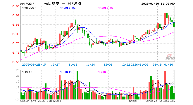 1月30日,截止午间收盘,光伏ETF指数基金(159618)跌3.35%,报0.836元,成交额428.75万元。光伏ETF指数基金(159618)重仓股方面,特变电工截止午盘跌2.49%,隆基绿能跌4.37%,阳光电源涨3.30%,TCL科技跌3.85%,通威股份跌4.56%,迈为股份跌4.35%,德业股份跌1.44%,正泰电器跌1.95%,TCL中环跌4.99%,捷佳伟创跌3.13%。