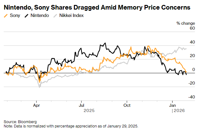 “除非内存价格大幅回落,否则任天堂将面临主机制造成本的‘绝对噩梦’,”专注于游戏行业的英国股票分析师PelhamSmithers指出。目前,任天堂股价已从去年8月的高点下跌超过30%,并在12月创下了自2008年以来最差的月度表现。