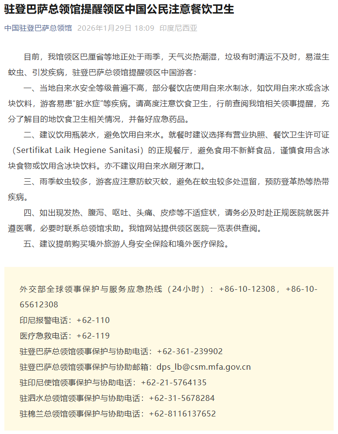 目前,我馆领区巴厘省等地正处于雨季,天气炎热潮湿,垃圾有时清运不及时,易滋生蚊虫、引发疾病,驻登巴萨总领馆提醒领区中国游客: