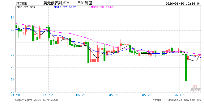 新浪外汇消息2026年01月30日,截至12时33分,外汇市场上美元兑俄罗斯卢布汇率跌破1美元兑换75.0000俄罗斯卢布。跌幅为-1.2508%
