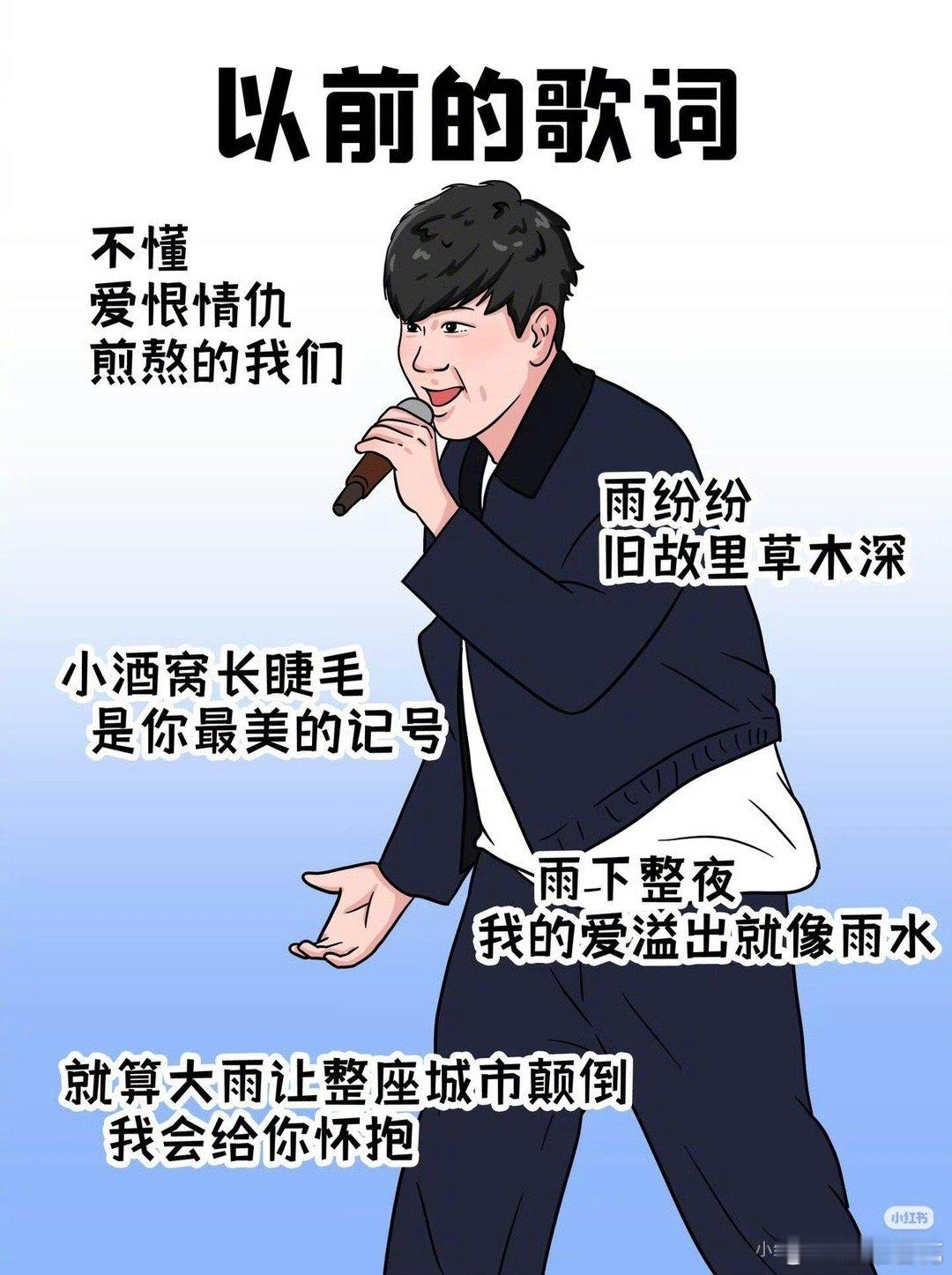 以前写歌vs现在写歌 以前写成长是“十年树木”的耐心,现在是“一夜长大”的仓促;以前看年轮悟理,现在靠大数据规划,老歌词的沉淀太珍贵~