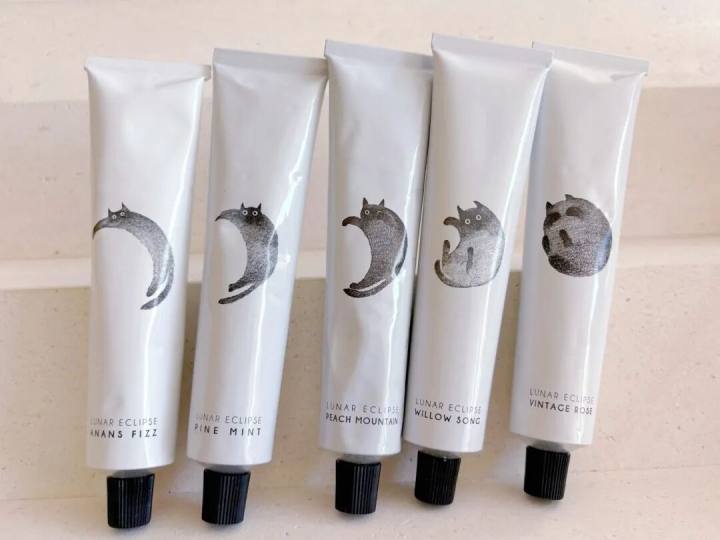 他拿起一组管状护手霜,盒面上的“喵星人”从舒展到蜷缩成一团,“这个系列叫‘月食’,5支放在一起,就是月全食的过程。”