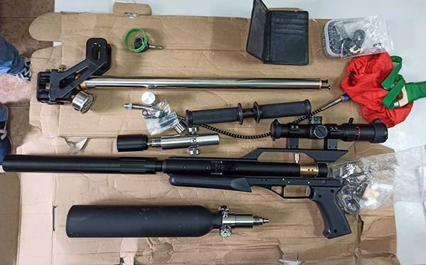 越南河内便衣警察在一驾驶车牌号为19M1-143.69的摩托车的年轻男子背包内搜到藏有一把气枪以及消音器、瞄准镜和气罐等许多部件。