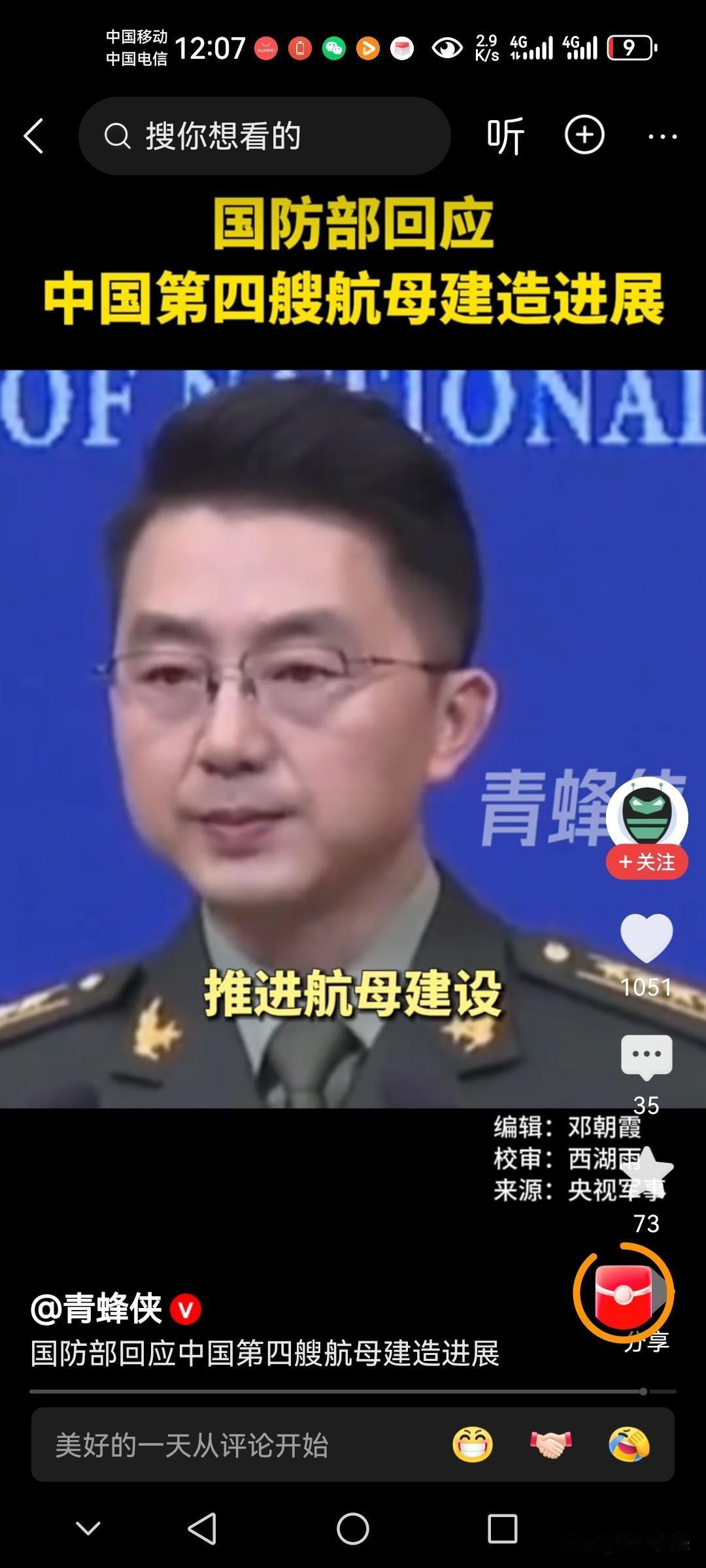 中国国防部正式回应关于第四艘航母的建设问题! 中国的语言技术博大精深,只有中国人自己懂,外界也难以揣测! 航母对中国来说游刃有余,中国有成熟的制造技术和能力,只要国家需要随时可以! 这记者看热闹不嫌事大! 记者问:随着福建舰航母正式服役并且形成战斗力,中国全面进入“三航母时代”,中国的第四艘航母是否取得实质性进展? 国防部发言人蒋斌大校称:我不了解你说的具体情况,中国始终根据国家安全和装备技术发展需要推进航母建设。 说白了中国不会盲目的去建造航母,中国也没有称霸的意愿,中国的军事力量是建立在国家需要的基础之上! 一切以国家利益为核心,一切以人民需要为准则!第四艘航母 三艘航母 中国航母技术