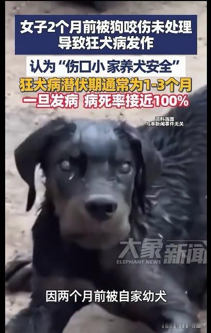 警惕!自家养的狗咬伤也应及时处理。 29日,大象新闻报道,“长沙一名女子两个月前被自家养的狗咬伤,当时认为是自己家养的狗、伤口又比较小,所以没有及时处理,结果两个月以后导致狂犬病发作”。 生活当中可能有不少的人认为是自己家养的狗,平时经常给狗洗澡,狗比较干净,而且还给狗接种过疫苗,有时被狗的牙齿刮伤皮肤或轻咬一下,应该没有什么关系,所以没有及时到医院处理,这样不知不觉就增加了健康风险,狂犬病的潜伏期是1∽3个月,病死率接近100%,一旦发病就很难救治。看到这则自家狗咬伤导致狂犬病发作的新闻后,我们应转变观念,不管是不是自家养的狗(猫),都要有一定的警惕性,如果被咬伤,只要有伤口、有出血,都要及时对伤口进行彻底冲洗,用肥皂水冲洗3~4次,不少于15∽30分钟,伤口和伤口周围用含碘的消毒液进行消毒,然后及时到医院注射疫苗。 现在养狗或养其它宠物的人很普遍,在我们享受乐趣的同时,对宠物也要有一定的警惕性,要避免被宠物咬伤损害身体健康。 狗咬伤 狂犬病毒感染 狂犬病毒疫苗 宠物狂犬病 犬咬伤事故