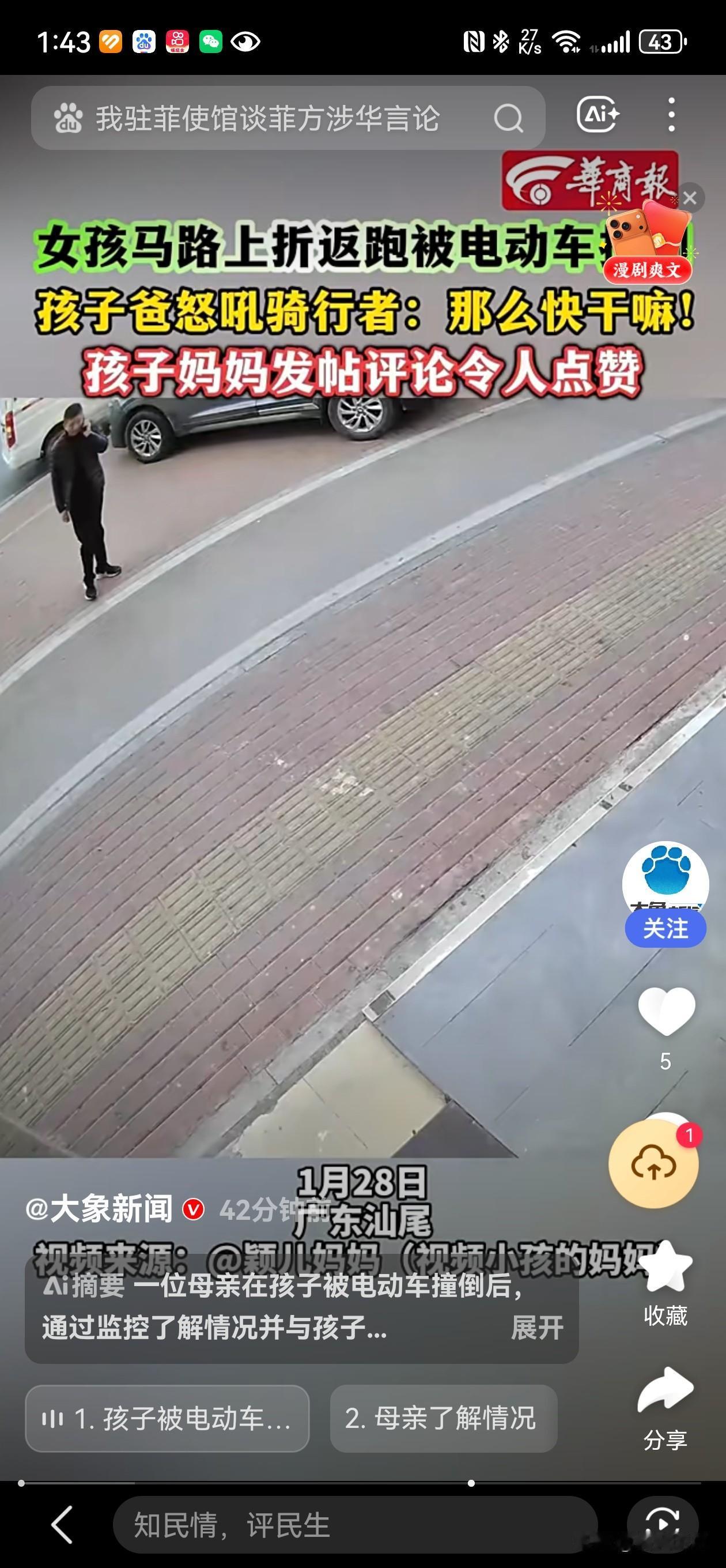 1月28日,广东一位妈妈晒出一段监控,画面显示孩子爸爸在马路对面打电话未制止在马路中间多次穿梭的女儿,结果女儿被一辆电动车撞倒。事后,男子赔付500元医药费,但孩子妈发帖称已把钱退回。 该帖引发网友热议,纷纷留言点赞这位妈妈。 这起事件引发了广泛关注和热烈讨论,反映出公众对家庭责任、孩子安全以及父母教育方式的关注。 父母的责任与教育:网友普遍认为,作为父母,应该时刻关注孩子的安全,尤其是在交通安全方面要加强教育和监管。父亲未能及时制止女儿,反映出责任感的缺失,也引发大家对家庭教育的反思。 对赔偿的态度:妈妈退还赔偿款,展现了她对孩子安全的重视和对责任的担当。网友纷纷点赞,认为这种行为体现了良好的家庭责任感和正确的价值观。 社会关注儿童安全:事件也提醒家长们要提高安全意识,尤其是在交通繁忙的道路边,要加强对孩子的监管和教育,避免类似悲剧再次发生。 这起事件提醒我们,家庭是孩子成长的第一课堂,父母的言传身教对孩子的安全意识和责任感培养至关重要。公众也应共同关注儿童交通安全,为孩子营造一个更安全的成长环境。 你怎么看?在家庭教育中,父母应如何平衡关爱与监管,确保孩子的安全?欢迎留言讨论!