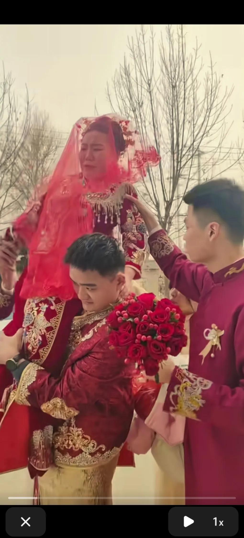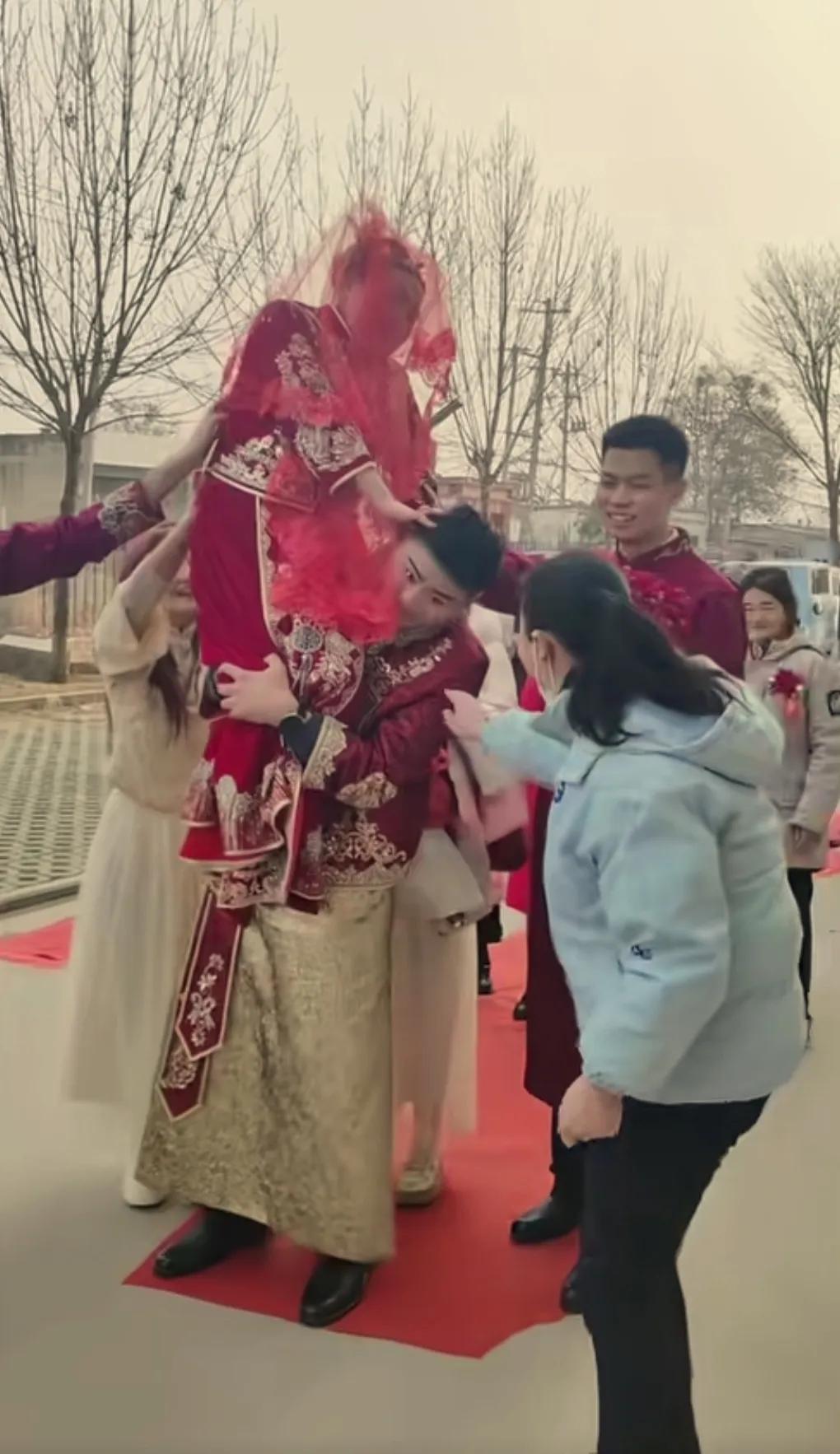 新郎年轻帅气,新娘长得成熟稳重。 新郎用尽全力的把新娘扛在肩膀上。 新娘害怕的花容失色,满脸惊恐,害怕摔下来。