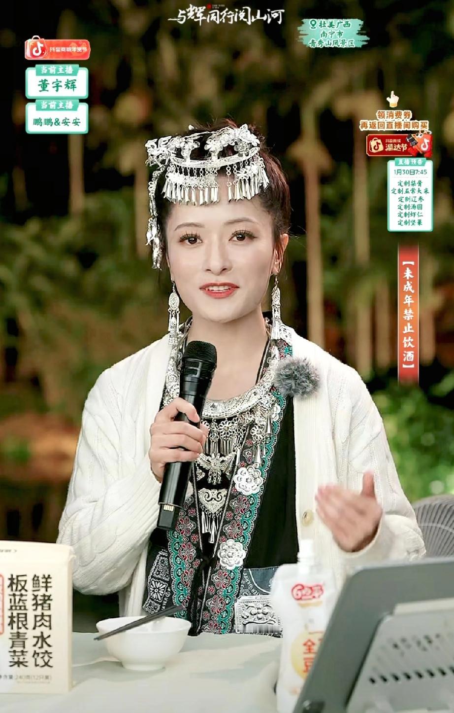 真的没想到,盼盼穿上这套民族服饰竟这么美!举手投足间给人一种当家主母的感觉,真让人惊艳! 这次广西行盼盼、安安和小贝都分别穿上了不同的民族服饰。 每个人穿上都有独特的魅力,盼盼端庄美丽,安安可爱漂亮,小贝优雅大方。这大概就是民族服饰的魅力吧。 民族服饰承载着深厚的文化内涵,有着独特的艺术表现力。每当身着盛装,便是与历史进行的一场隆重的对话。服饰上的每一种纹样图案都是一个等待被解读的古老密码。经纬之间交织着的是祖先的智慧与祝福。有人说民族服装饰“一针一线皆故事,一衣一带尽风华”。 董宇辉每到一个地方阅山河都会让主播们穿上当地的民族服饰,感受当地的风土人情,学习当地的传统文化。这就是与辉同行阅山河的意义所在吧! 董宇辉 与辉同行