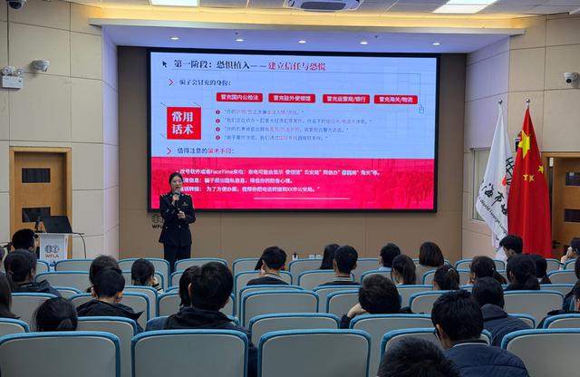 “同学们,这是真实发生的案例!一名留学生在一个多月的时间里被骗子深度洗脑,遭遇了‘剧本杀’模式的电信网络诈骗……”