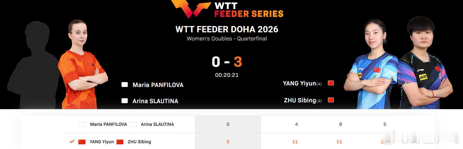 2026WTT支线赛多哈站女双,杨屹韵/朱思冰、韩菲儿/范姝涵、覃予萱/纵歌曼分别以3-0的比分战胜对手,晋级四强。