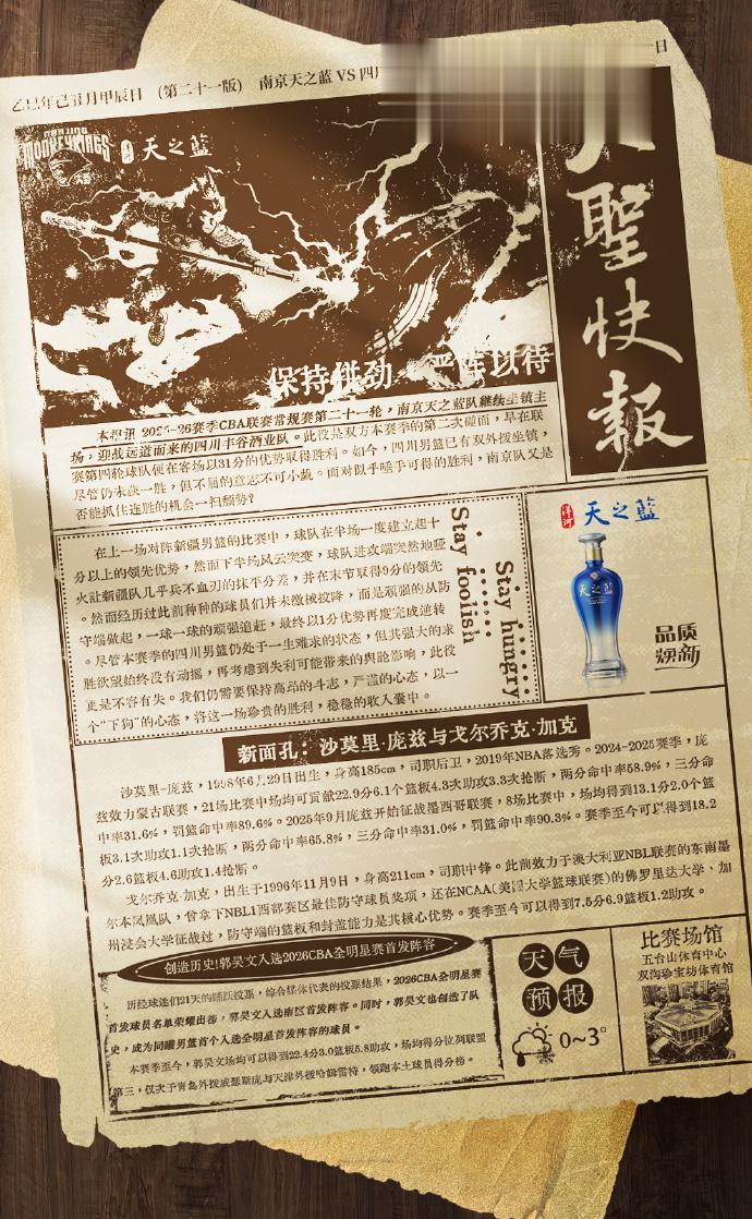 赛前,南京男篮分享对阵四川男篮海报:保持拼劲,严阵以待。