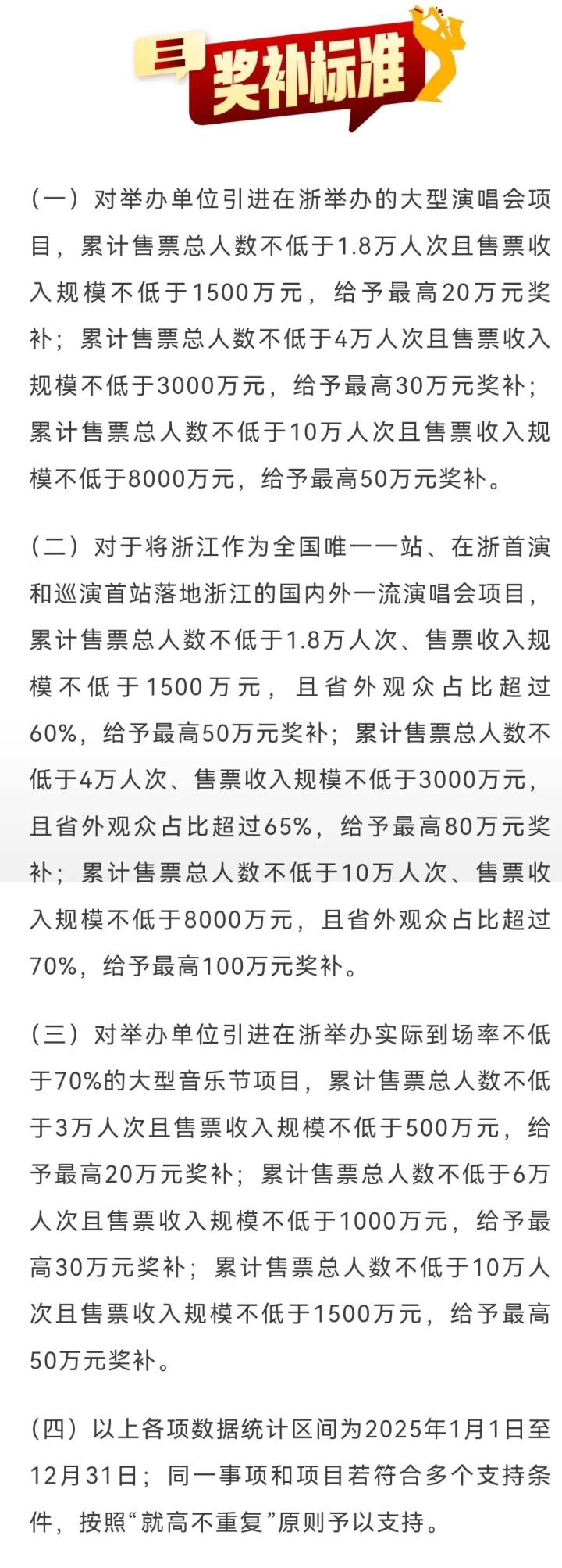 其中,“将浙江作为全国唯一一站、在浙江首演和巡演首站落地浙江的国内外一流演唱会”,将根据演出售票规模进行不同程度的奖补,奖金分为最高20万元、最高30万元、最高50万元、最高80万元等档。其中,对于将浙江作为全国唯一一站、在浙江首演和巡演首站落地浙江的国内外一流演唱会项目,若累计售票总人数不低于10万人次、售票收入规模不低于8000万元,且省外观众占比超过70%,给予最高100万元奖补。
