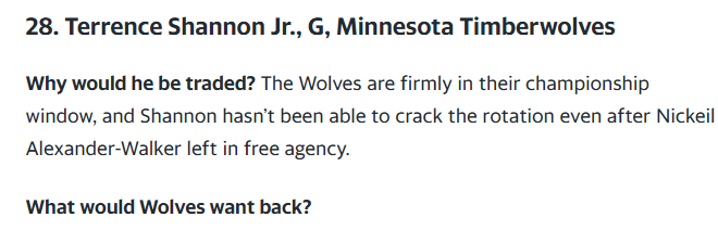 交易动因:森林狼正处于争冠黄金窗口期,即便亚历山大-沃克以自由球员身份离队,香农依旧未能挤进球队常规轮换。森林狼要价:无(原文为空白)