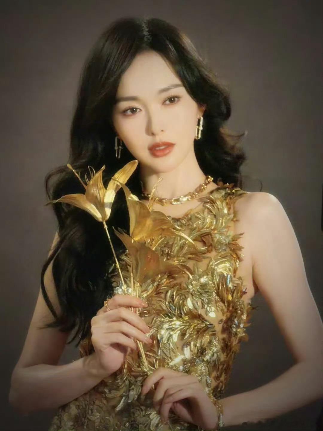 唐嫣品牌活动造型出图,金色礼裙,代言人好美