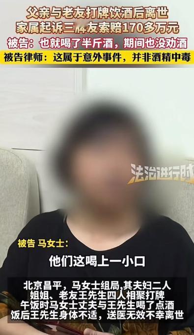 “这次法院没有和稀泥!“北京昌平。父亲与老友打牌饮酒后离世,女儿起诉三牌友索赔170多万元!三牌友:也就喝了半斤酒,期间也没劝酒。被告律师:这属于意外事件,死者身体本身就有问题,并非酒精中毒!网友:看完过年不敢约人喝酒了! 那天是个再普通不过的周末。王女士的父亲王先生,六十出头,退休后生活规律,平日最大的爱好就是和几位老朋友打打牌、聊聊天。 老马是他认识了二十多年的牌友,几个人感情不错,逢年过节或谁家有点小事,都会凑在一起吃顿饭、喝点酒。 那天中午,老马张罗了一桌饭,地点就在昌平一处普通的居民小区里。人不多,除了王先生,还有另外两位老牌友。 菜是家常菜,酒也是普通的白酒。按后来三名牌友在法庭上的说法,当天大家只是“随意喝点”,并没有拼酒、劝酒,更没有起哄。 王先生自己端杯、自己倒酒,喝得并不算多,前后加起来也就半斤左右。 饭桌上的气氛很轻松。几个人聊着以前的工作、退休后的生活,还调侃谁最近血压又高了,谁又被医生叮嘱少喝酒。 王先生也提到过,自己有高血压和冠心病,平时一直在吃药控制。但他说话时神情自如,没有表现出明显不适。 饭后,几个人收拾完桌子,准备打会儿牌。可没坐多久,王先生突然觉得不对劲。他先是皱了皱眉,说胸口有点闷,像被什么压着一样。 紧接着,他的脸色开始发白,额头冒汗,人也有些站不稳。 老马见状,赶紧把牌推到一边,扶着王先生坐下,问他要不要紧。王先生摆了摆手,说有点头晕,可能是刚才喝了酒,缓一会儿就好。 可话音刚落,他整个人突然瘫软下来,呼吸变得急促。 屋里的气氛一下子紧张起来。有人立刻掏出手机拨打120,有人去开窗通风。救护车很快赶到,把王先生紧急送往医院。一路上,医护人员进行了心肺复苏,但情况并不乐观。 最终,医院还是没能把人抢救回来。死亡证明上写得很清楚:直接死因为急性心肌梗死,合并呼吸心跳骤停。血液检测结果显示,王先生体内的酒精浓度远未达到酒精中毒的标准。 噩耗传来时,王女士正在上班。她赶到医院,看着父亲冰冷的身体,当场崩溃。她怎么也想不通,明明只是一次普通的聚会,怎么人就再也回不来了。 料理完父亲的后事,王女士心里的悲痛慢慢转化成了愤怒。在她看来,如果那天父亲没有喝酒,如果牌友们能再多劝一句,也许悲剧就不会发生。 她咨询了律师,最终将当日一起打牌饮酒的三名牌友告上法庭,索赔医疗费、死亡赔偿金、精神损害抚慰金等共计170多万元。 庭审中,王女士情绪激动。她认为,父亲年纪不小,又有基础疾病,三名牌友明知这些情况,却仍然与其饮酒,对悲剧的发生负有不可推卸的责任。 她强调,饭局属于共同饮酒行为,作为同饮者,应当尽到合理的注意义务。 而三名被告则感到十分委屈。他们表示,当天并未劝酒,也未强迫王先生饮酒,酒量完全由王先生自己掌控。发现王先生不适后,大家第一时间拨打了120,没有任何拖延或不当处置。 被告代理律师在法庭上进一步指出,王先生的死亡原因是急性心肌梗死,而非酒精中毒。 从医学角度看,王先生本身患有多年高血压和冠心病,这类基础疾病本就存在突发风险。本案属于突发意外事件,三名被告在法律上不存在过错。 法院审理后认为,现有证据无法证明三名牌友存在劝酒、逼酒或其他明显过错行为。 同时,王先生作为完全民事行为能力人,应当对自身身体状况和饮酒风险有基本判断。其死亡结果与自身疾病有直接因果关系,缺乏将责任归咎于同饮者的法律依据。 最终,法院依法驳回了王女士的全部诉讼请求。 判决结果出来后,王女士久久无法释怀。她并非不明白法律的结论,只是情感上难以接受父亲就这样离开,而自己却无处追责。 案件在网络上传开后,引发了大量讨论。 有网友表示理解法院判决,认为不能把所有悲剧都归咎于一起吃饭的人;也有人感慨,人到中年,聚会喝酒看似寻常,背后却暗藏风险。