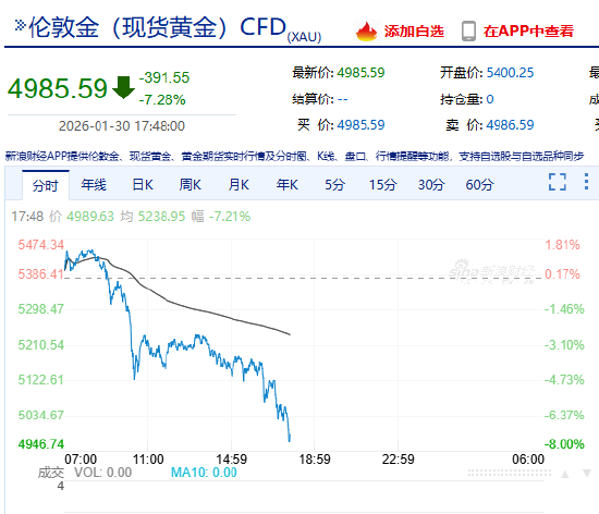 北京时间1月30日下午,现货黄金跌势不止,下破5000美元/盎司关口,日内大幅下挫近400美元,较昨日创下的历史高点跌去近600美元。