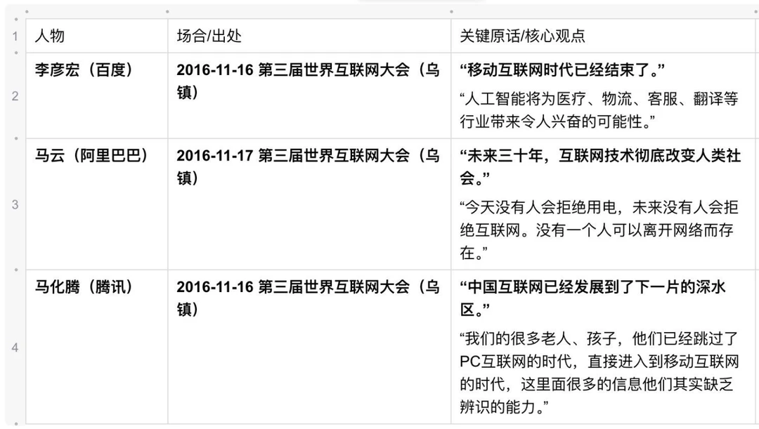 BAT三个创始人此前针对同一议题的密集发声,最令人印象深刻的还得是2016年的乌镇第三届世界互联网大会。当时马云表示,未来三十年,互联网技术将彻底改变人类社会;马化腾认为,中国互联网已经发展到了下一片深水区;李彦宏则指出,移动互联网时代已经结束了,人工智能将为医疗、物流、客服、翻译等行业带来令人兴奋的可能性。