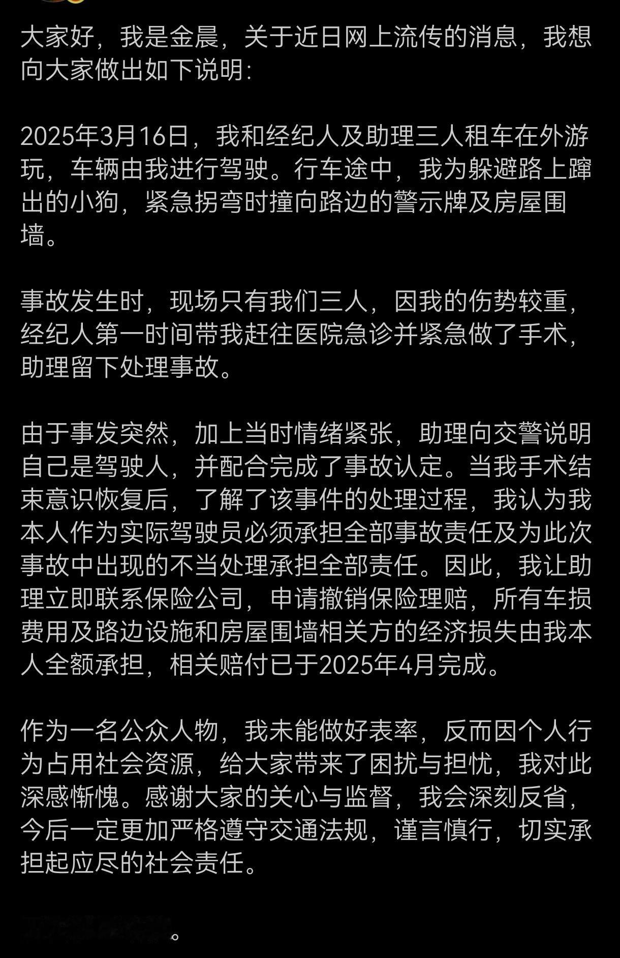 终于等到金晨的回应了, 金晨承认去年3月撞车是自己开的车, 当时为躲小狗撞了东西, 她伤重先去做手术, 让助理顶包认了责。 她醒后让助理撤了保险理赔, 所有损失自己全赔了,也认了错, 说自己没做好表率, 以后会守交规担责任, 大家对这个结果认不认?