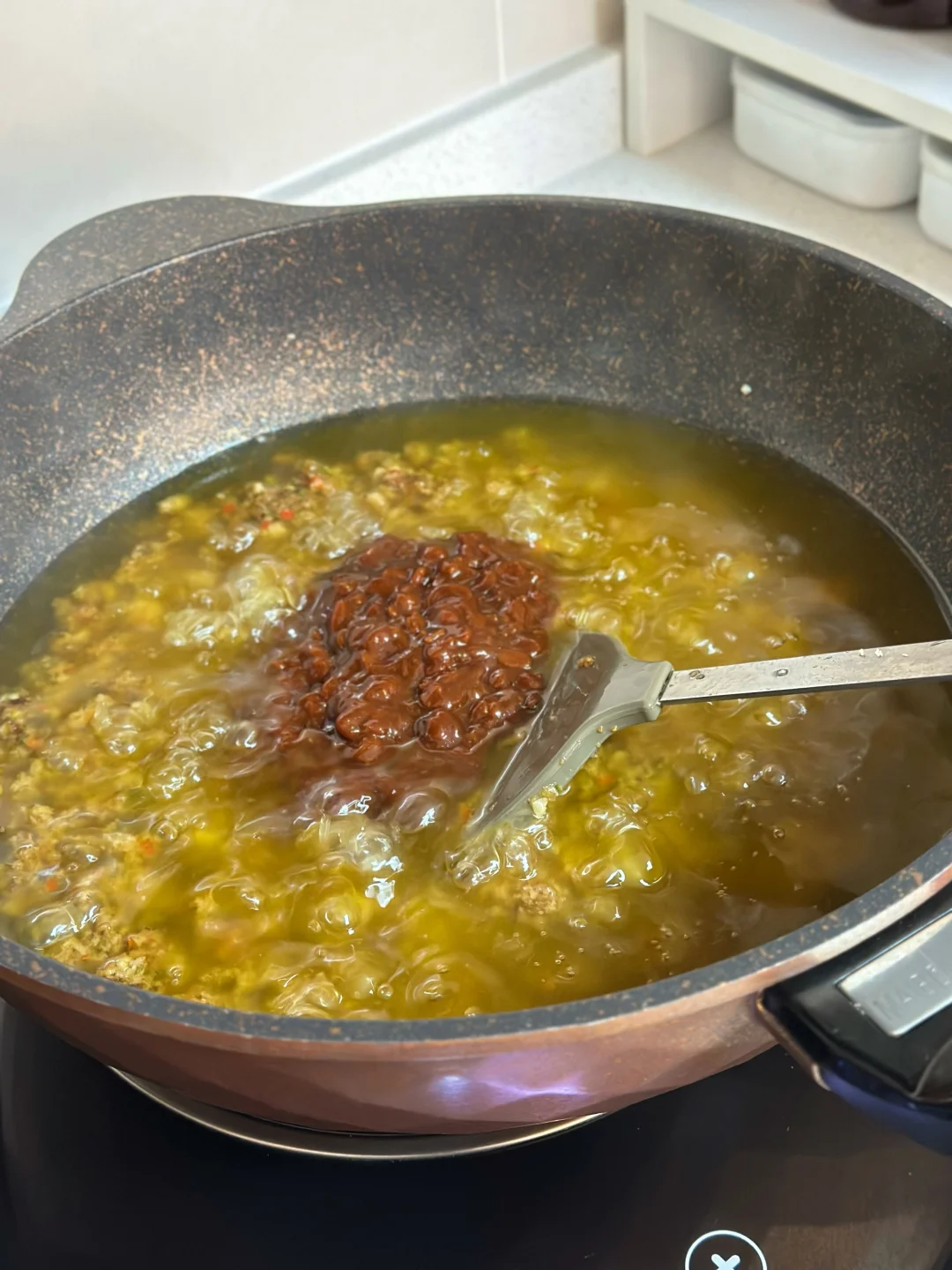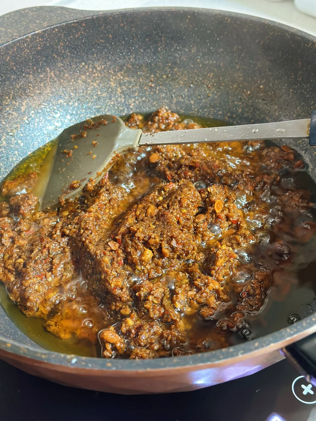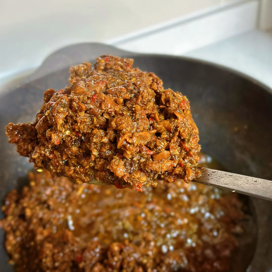 3. 锅内下足够的油,油要多!油有点热后下辣椒大蒜末翻炒,再加入菇碎不停翻炒,然后加入黄豆酱、糖、生抽、香菇素蚝油、白胡椒粉一起翻炒均匀,开小火慢慢熬煮,熬差不多一小时,水分变比较少的时候就可以加一些熟芝麻翻均匀出锅。(没有可以不加)