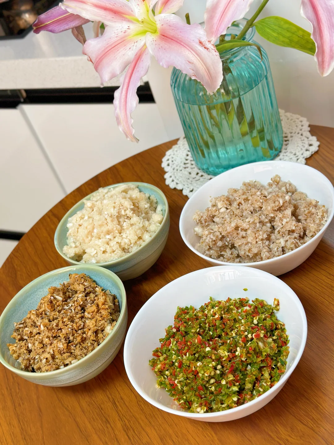 2. 把所有的原材料处理成碎~洋葱、蒜、辣椒把多余水分逼出,喜欢吃辣的小米辣多放一些,后面炒的时候还放了干辣椒面