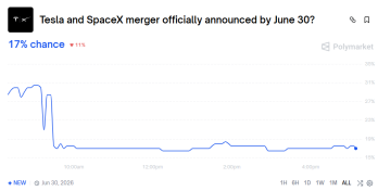 预测平台Polymarket最新数据显示,年中前二者合并概率达46%,远超特斯拉与xAI的16%,资本市场的预期一目了然。
